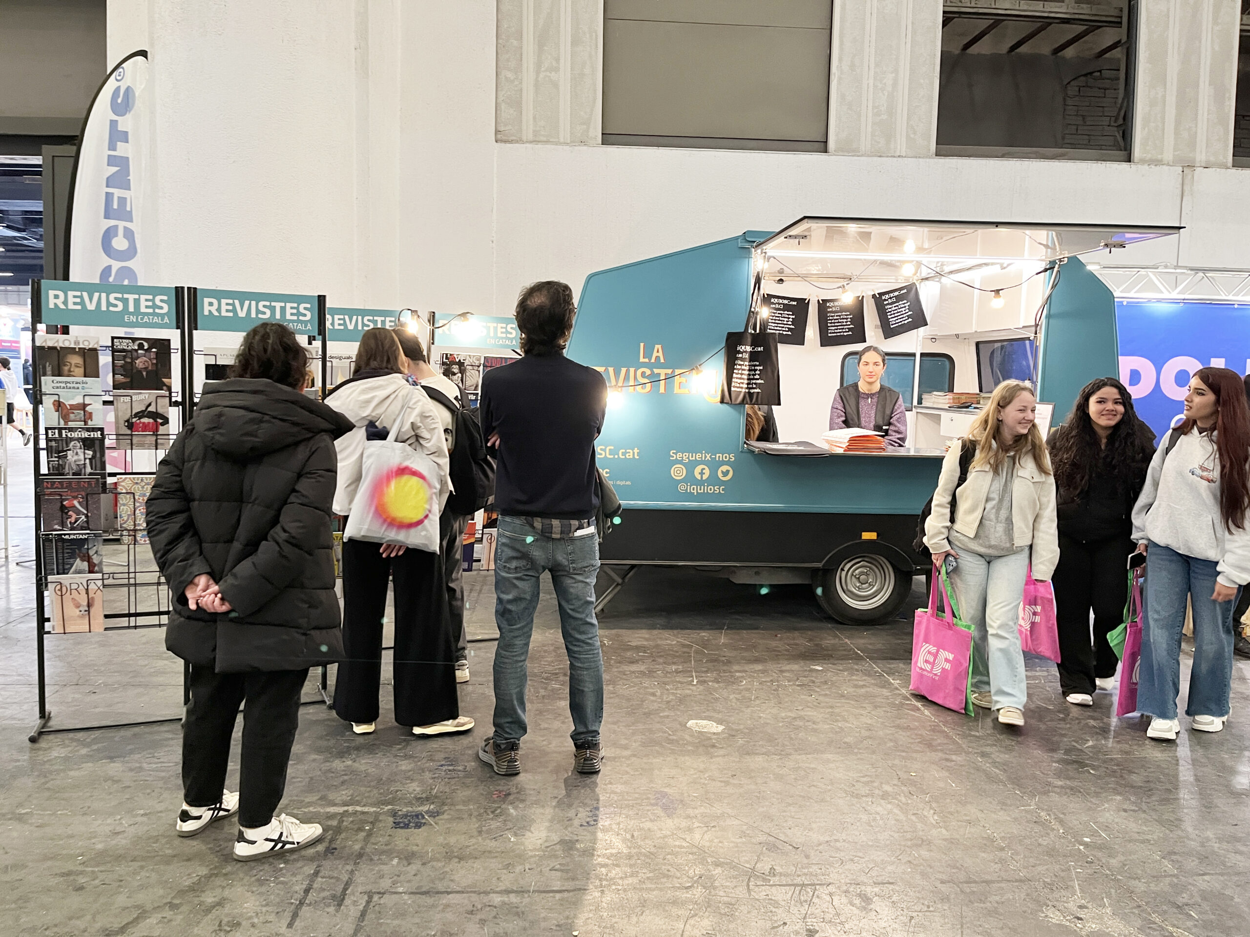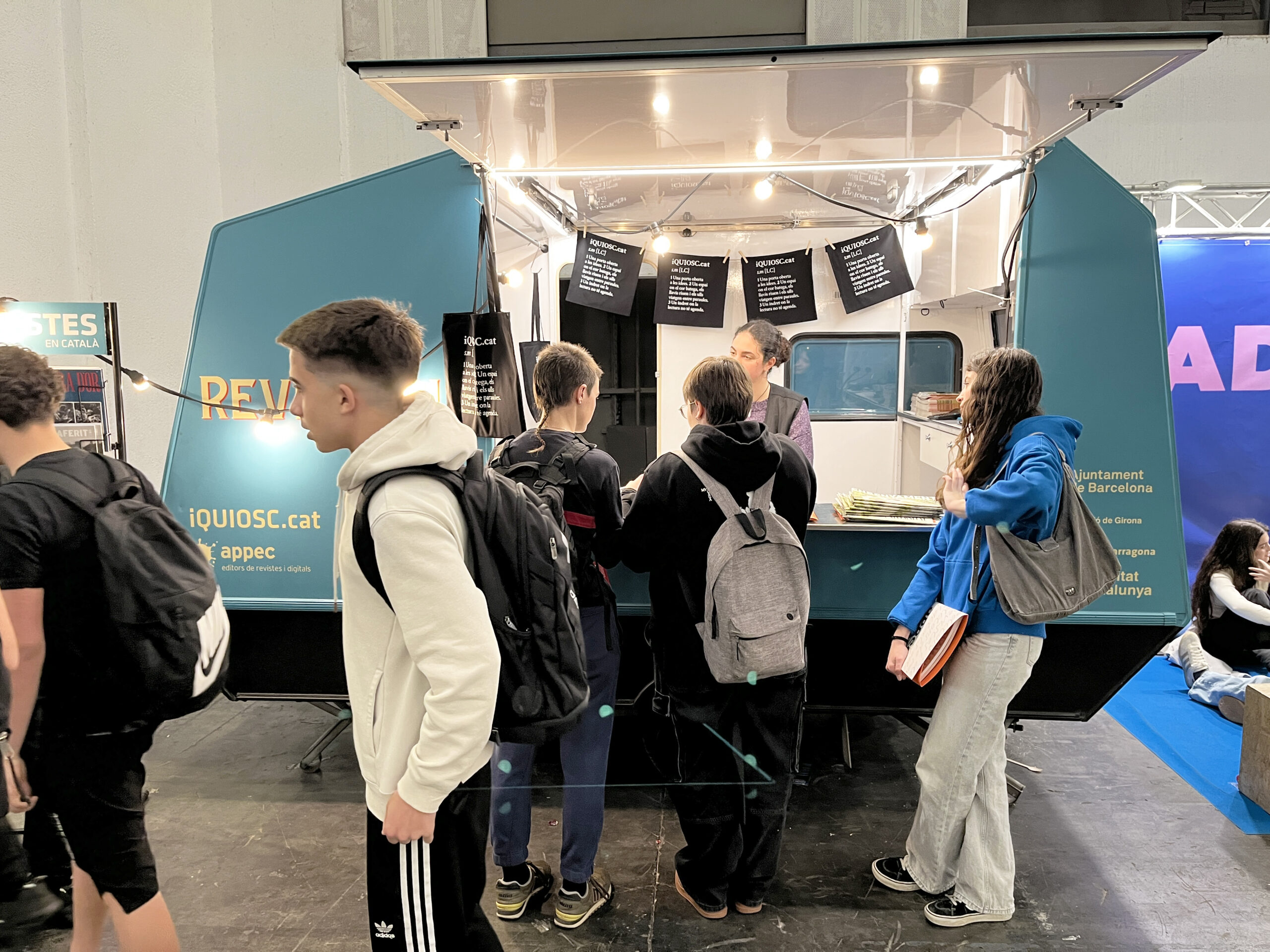 La Revisteria es va ubicar a la zona d’Adolescents.cat, amb qui vam col·laborar en diversos sortejos. Els nostres premis incloïen motxilles, bosses de tela i ampolles de l’iQUIOSC.cat, una petita mostra de revistes en català i una entrada doble als Premis Enderrock.
