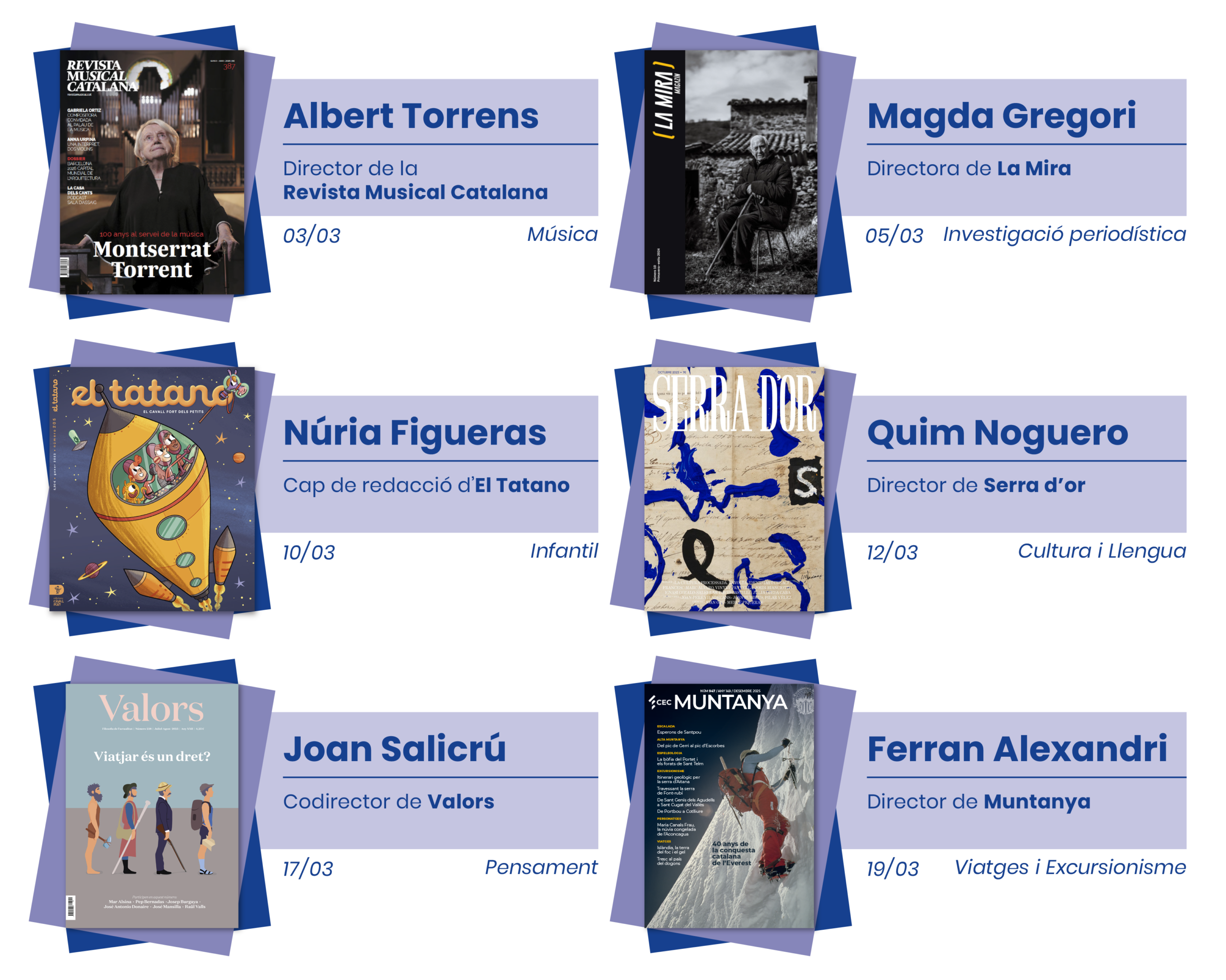 Durant aquest cicle s’exploraran sis àmbits clau de la vida cultural i social del país: Música, Infantil, Pensament, Investigació Periodística, Cultura i Llengua, i Viatges i Excursionisme, des de la perspectiva de diverses revistes temàtiques de l’APPEC; Revista Musical Catalana, El Tatano, Valors, La Mira, Serra d’Or i Muntanya.
